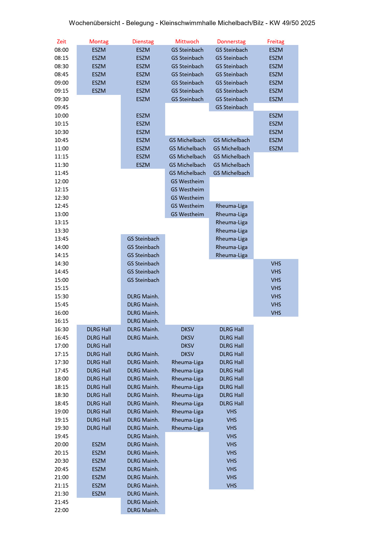 in der Nutzungsübersicht haben wir exemplarisch die Belegung der Kleinschwimmhalle basierend auf einer Datenerhebung in KW 49/50 im Jahr 2025 visualisiert.