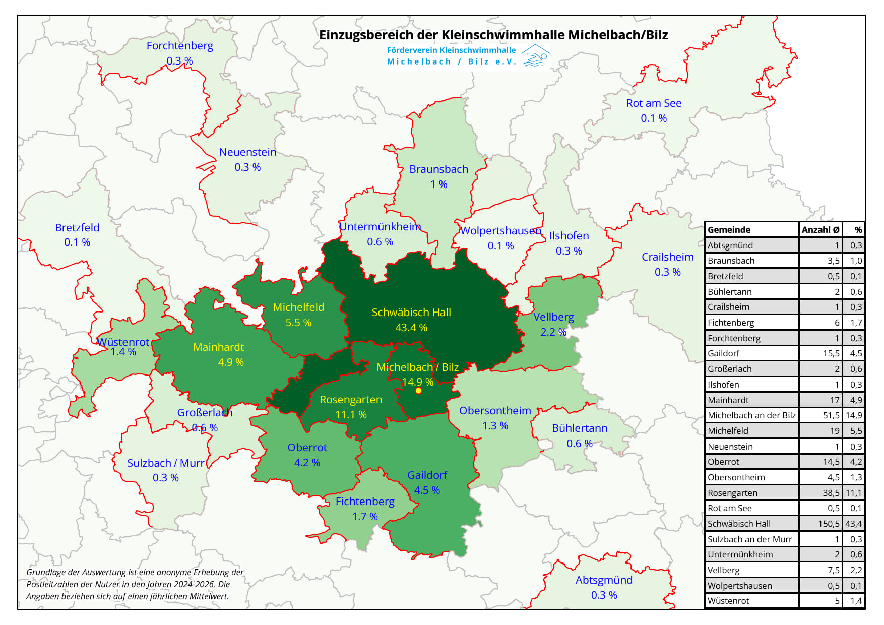 basierend auf einer anonymen Erhebung der Postleitzahl der Nutzer der Kleinschwimmhalle Michelbach/Bilz haben wir den Einzugsbereich grafisch visualisiert.