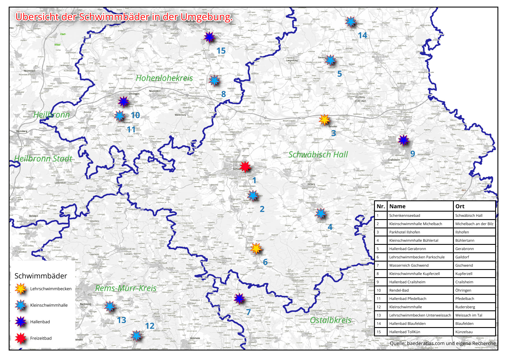 In der verlinkten PDF-Datei haben wir die sich in der näheren Umgebung befindlichen Schwimmbäder (Lehrschwimmbecken, Kleinschwimmhallen und Hallenbäder) in einer Karte dargestellt.