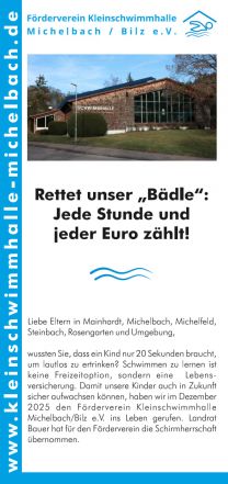 Um den Fortbestand der Kleinschwimmhalle in Michelbach/Bilz zu sichern, haben engagierte Bürger den Förderverein Kleinschwimmhalle Michelbach/Bilz gegründet. Ziel des Vereins ist es, den Weiterbetrieb der Einrichtung aktiv zu unterstützen und gemeinsam mit Kommunen, Nutzern, Spendern, Fördermittelgebern und Politik tragfähige Lösungen zu entwickeln, um den Erhalt des Hallenbads langfristig zu sichern.