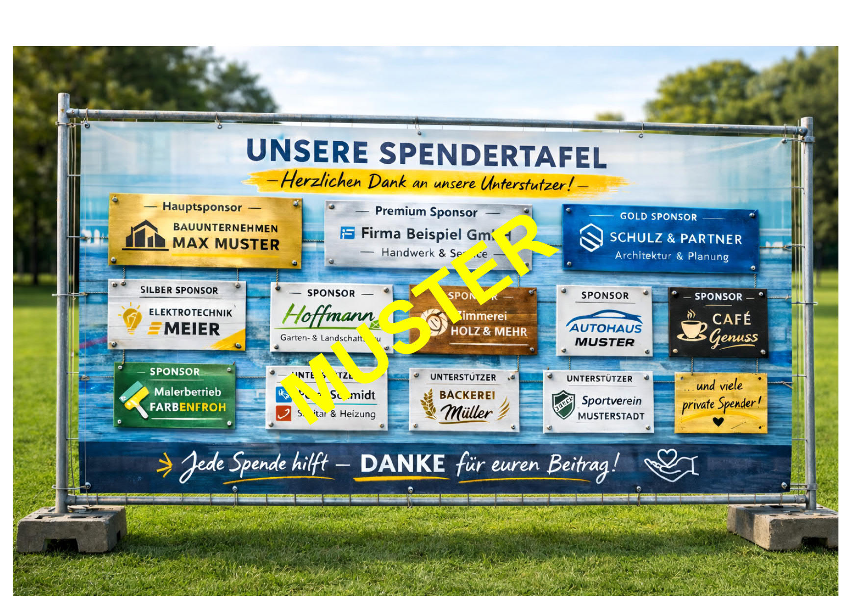 Je nach Höhe der Spende stellen wir zwei unterschiedlich große Werbeflächen zur Verfügung. Ab 2.500 € erhalten Sie die normale Größe und ab 5.000 € Spende erhalten Sie die große Werbetafel.